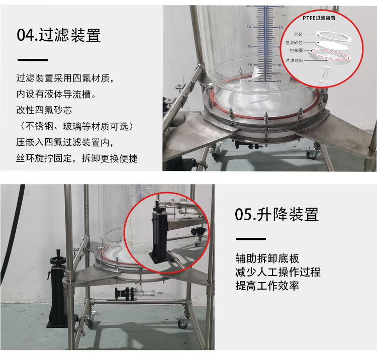 固相反應(yīng)釜/過濾反應(yīng)釜可用于攪拌、過濾、抽濾、多肽合成、結(jié)晶、裂解等工藝。攪拌采用真空負壓進行抽濾,高硼硅玻璃釜體,透明度高,能夠方便的觀察實驗過程