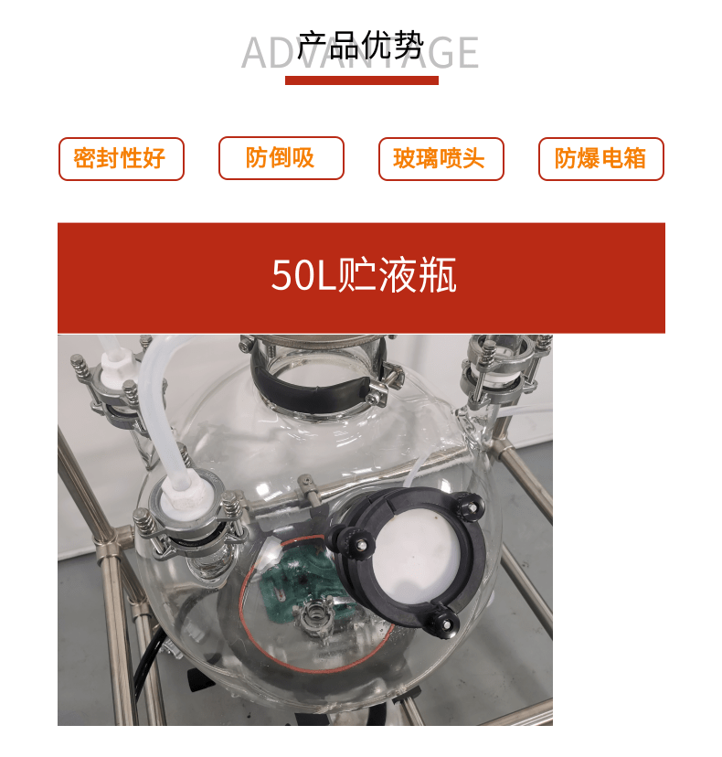 本款防爆尾氣吸收,配備三個防倒吸罐。磁力循環(huán)泵將吸收液從圓底燒瓶打入噴淋頭,從頂部落下。廢氣反方向進(jìn)入吸收柱,兩者充分接觸后,快速達(dá)成凈化。